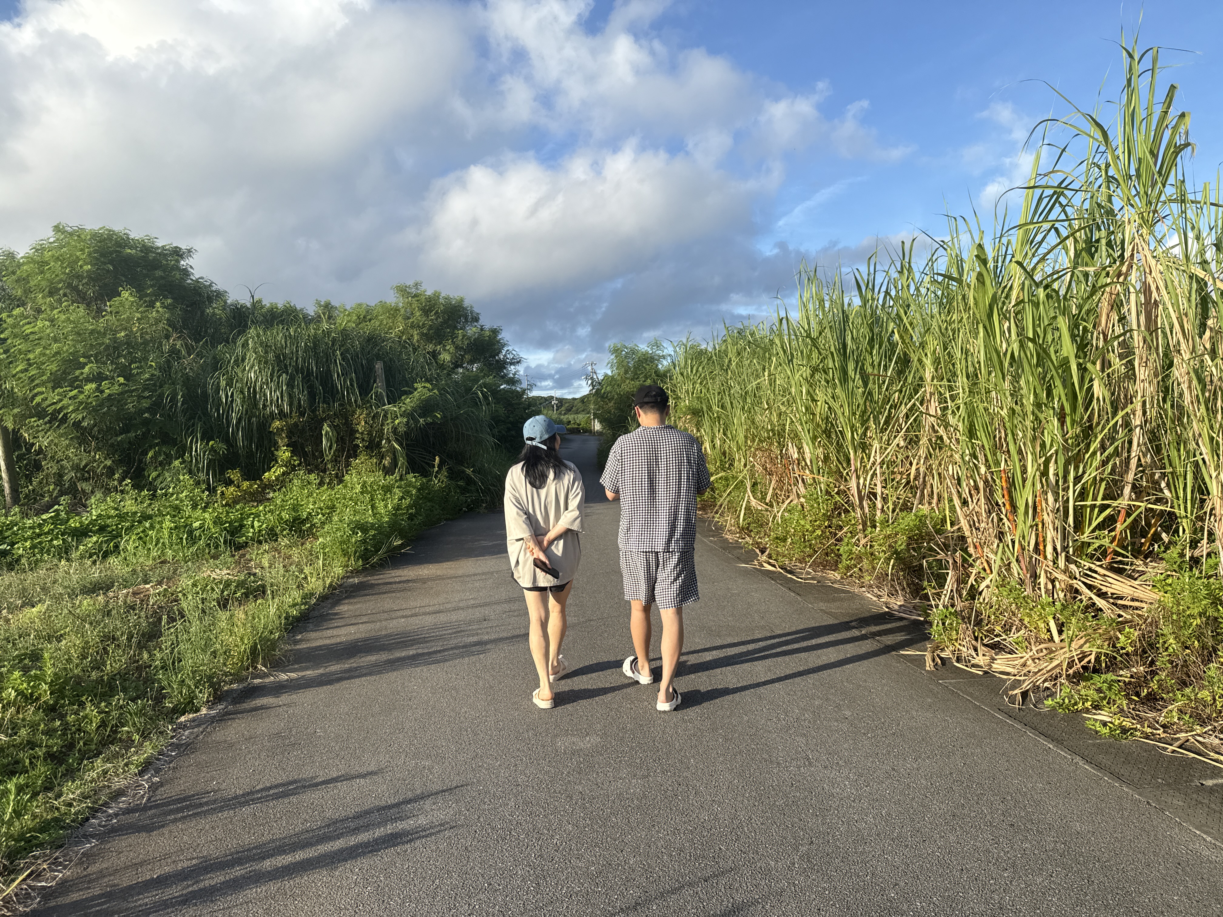 숙소문을 열고 나서자 아직 이른 아침인데도 하늘은 푸르고 구름 한 점 없이 맑은 파란빛. 길가엔 사탕수수밭이 쭉 이어져 있었습니다. 마주한 풍경이 너무 아름다워 아직도 머릿속에 선명합니다. 일본 특유의 한적하고 조용한 골목을 거니는 기분....오래된 일본 드라마 속 한 장면에 들어간 듯 했어요..